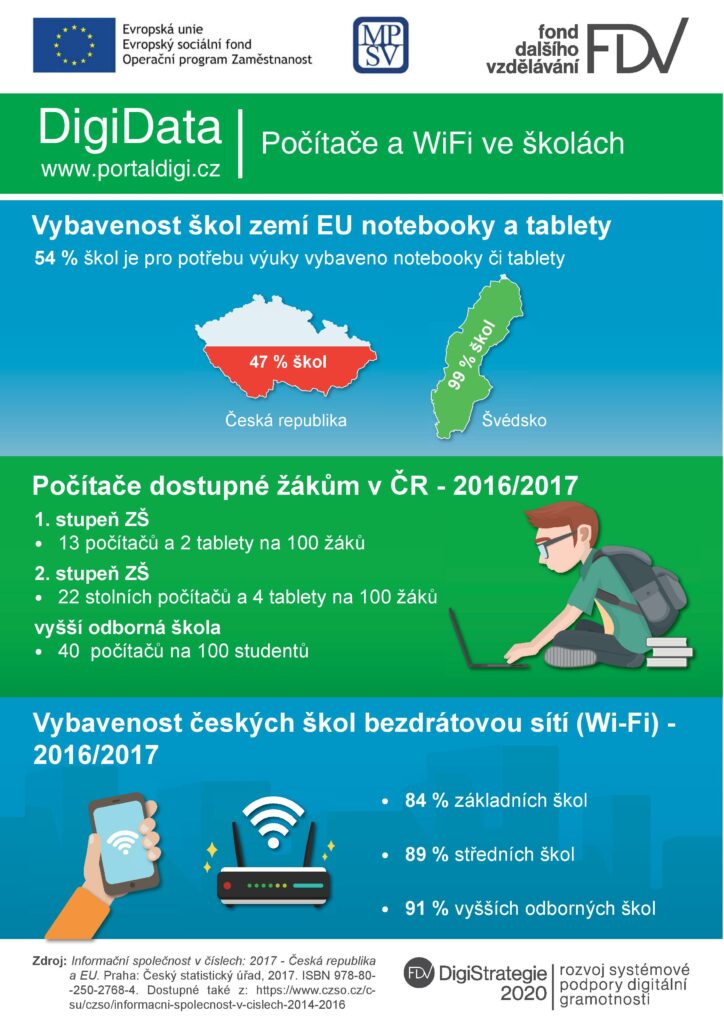 V zemích EU je 54 % škol vybaveno notebooky či tablety. Jaká je dostupnost počítačů a bezdrátové WiFi v ČR?